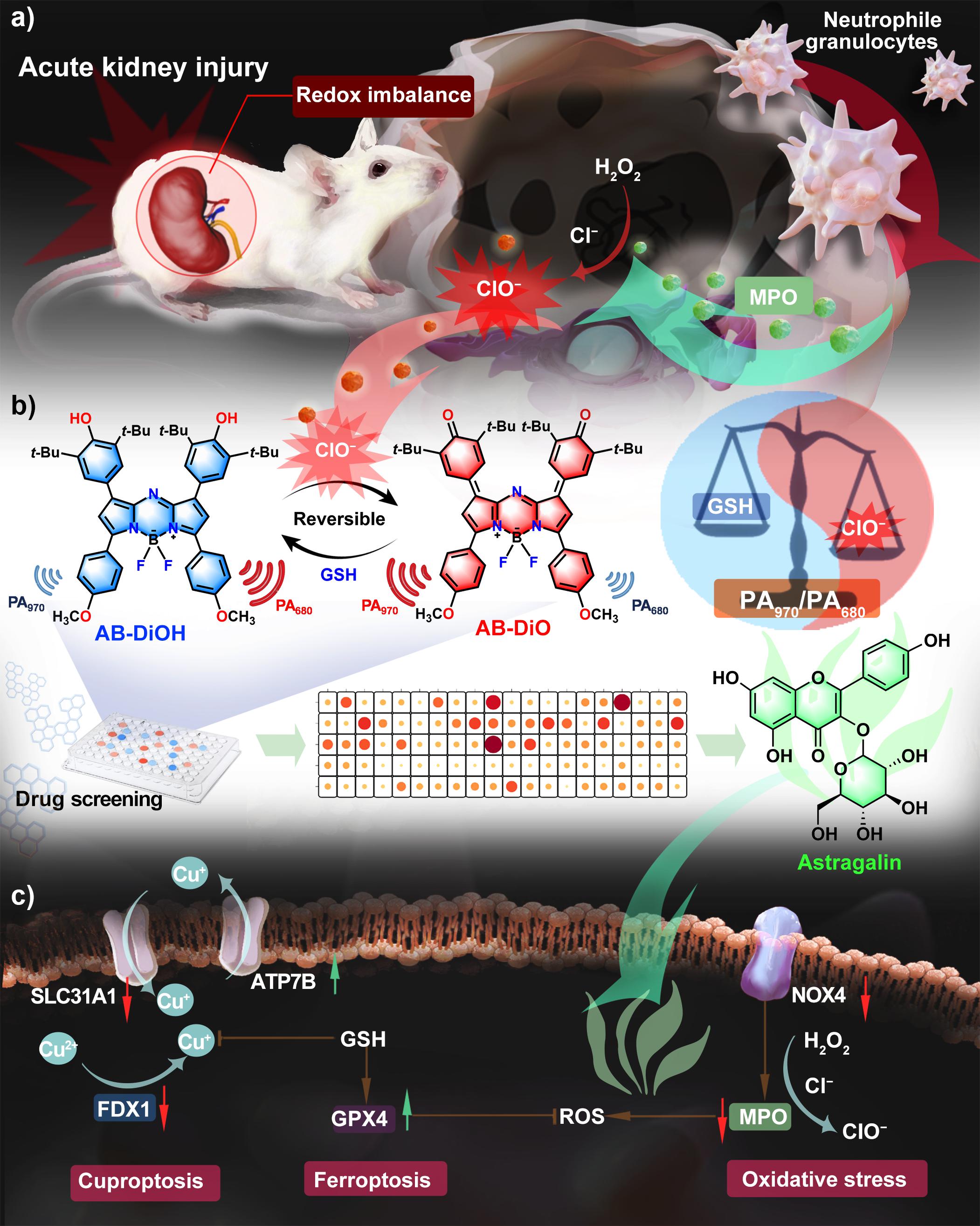 为解决这一问题,该团队研发了一种基于3,5-二叔丁基-4-羟基苯基取代氮杂氟硼二吡咯亚甲基的小分子光声探针(AB-DiOH)。该探针可在近红外区域对AKI早期阶段的氧化还原(ClO−/GSH)失衡展现出高灵敏度与特异性的可逆响应。在动物模型实验中,这一探针成功实现了对AKI的早期、原位、动态和可视化检测,并且其准确性得到了金标准肾脏病理切片的验证。此外,该团队还利用所开发的光声探针建立了一种“体外光谱-体内成像”的药物高通量筛选方法,从中药化学成分库中筛选对AKI具有治疗潜力的成分。研究结果显示,紫云英苷对AKI具有显著的改善作用,初步研究还揭示了紫云英苷通过调控氧化应激、铁死亡与铜死亡信号通路发挥缓解AKI的作用机制。这一研究为AKI的早期检测、中药活性成分筛选与机制研究提供了新的视角和方法。未来,团队将进一步优化分子探针的性能和应用范围,探索紫云英苷在AKI治疗中的应用前景,并期望与临床研究人员合作,推动这一技术的临床转化和应用。