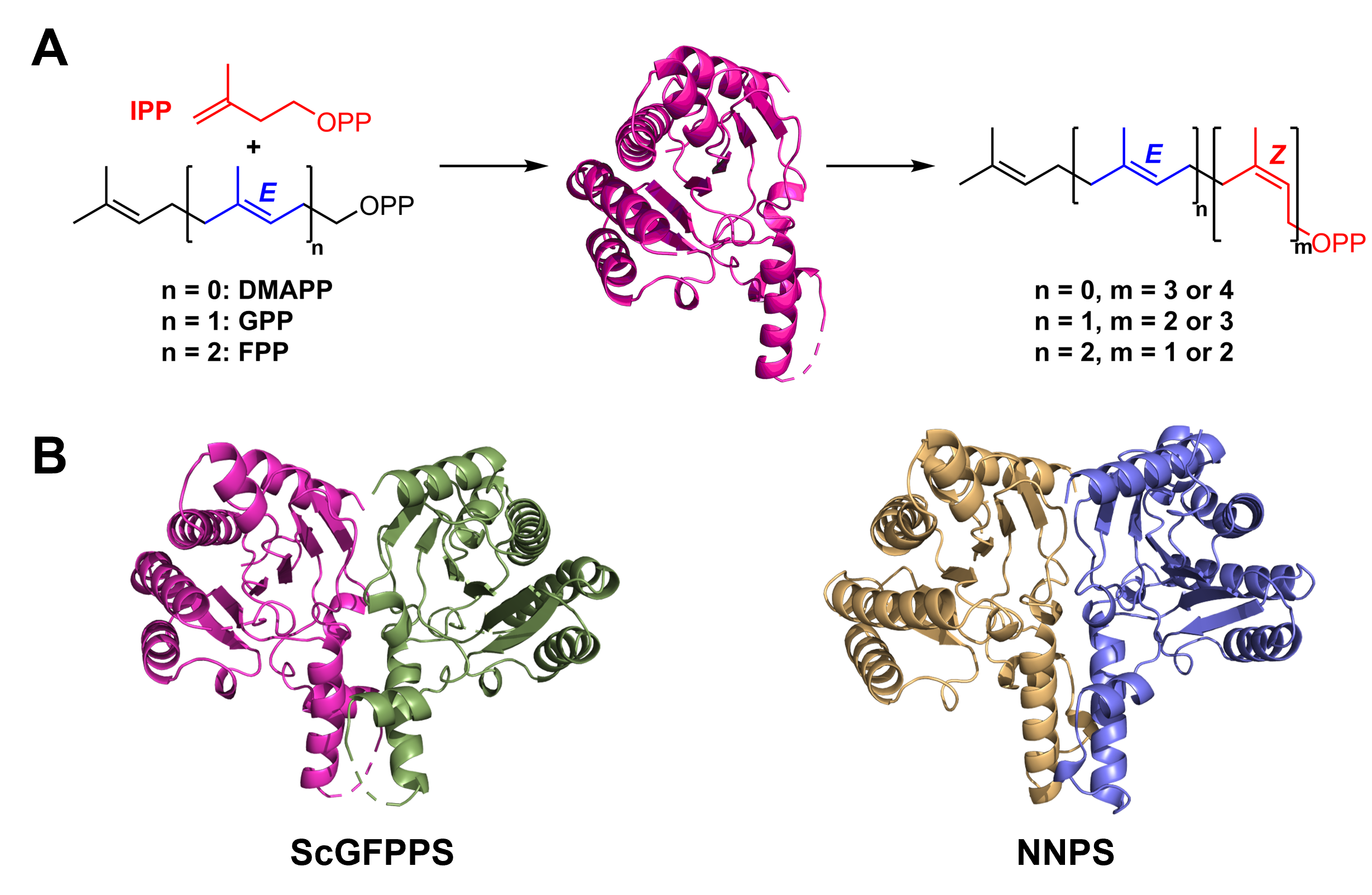图A:ScGFPPS的功能表征;图B:ScGFPPS及NNPS的蛋白晶体结构