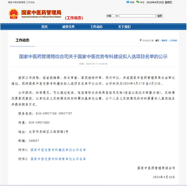 附件:国家中医药管理局公示链接://www.natcm.gov.cn/yizhengsi/gongzuodongtai/2024-04-17/33866.html
