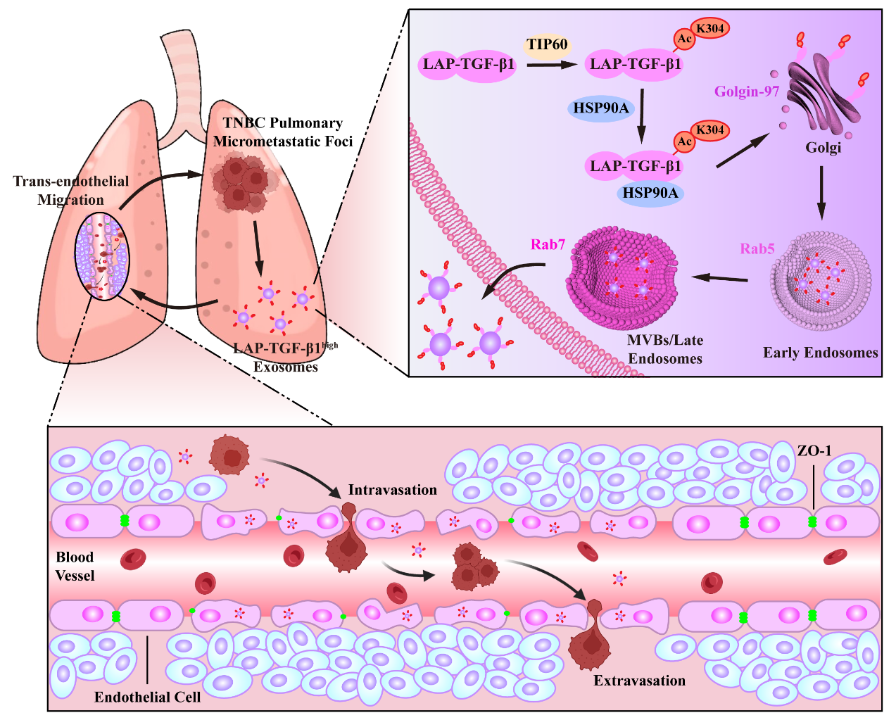 本研究揭示了TNBC外泌体负载LAP-TGF-β1在重塑肺血管生态位,促进TNBC肺转移中的关键作用。尽管各种阻断TGF-β信号通路的策略已经开发出来并取得了临床进展,但其严重的副作用限制了其临床应用。本研究发现,在肺转移部位,TNBC外泌体上的LAP-TGF-β1可以在远低于游离型TGF-β1的剂量下显著重塑肺血管生态位,促进TNBC细胞在肺部的外渗和定植。进一步的研究发现在LAP-TGF-β1的TGFB1区域存在一个非经典的KFERQ样序列,其K304位点会发生乙酰转移酶TIP60介导的乙酰化,促进与HSP90A的相互作用而转运至外泌体。同时抑制HSP90A和TIP60可显著降低LAP-TGF-β1的外泌体负载量,有效抑制TNBC肺转移。该研究不仅为TNBC肺转移的分子基础提供了新的见解,而且为开发新型的治疗策略奠定了基础。