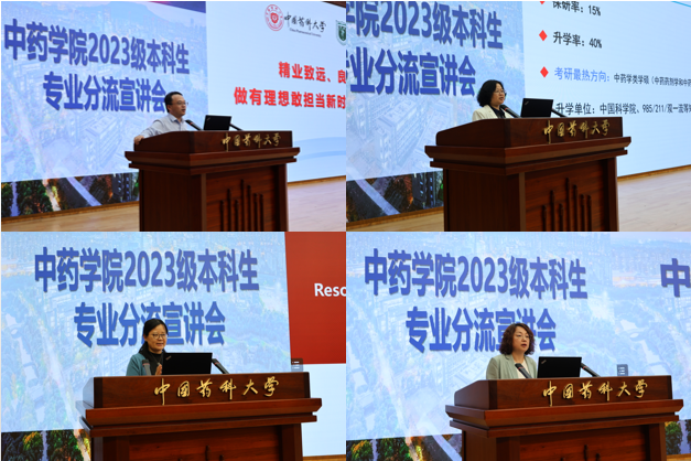 随后,谭宁华教授、张朝凤副院长、殷志琦副院长分别介绍了中药制药、中药资源与开发、中药学专业情况,就专业历史沿革、培养目标、专业特色、课程体系及各专业升学就业前景等方面进行了全面解读。殷志琦副院长解读了2023级学生专业分流的学校工作原则和通知安排,及中药学类专业分流实施方案的重要事项。