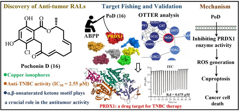 三阴性乳腺癌(TNBC)恶性程度高,缺乏有效靶向治疗,化疗疗效有限且易耐药,亟需新机制药物。本研究基于生物功能导向分离与分子网络可视化策略,从中药紫菀内生真菌中获得24个系列RALs类化合物,发现Pochonin D(PoD)为天然铜离子载体,能通过共价结合PRDX1的Cys173位点,抑制其酶活,促进胞内铜离子累积和ROS生成,诱导铜死亡以发挥抗TNBC活性。该研究首次发现PRDX1为铜死亡关键靶点,揭示其调控铜代谢与氧化应激的新机制,为TNBC提供靶向铜死亡的新型治疗策略,推动相关药物研发。相关工作以“Discovery of natural resorcylic acid lactones as novel potent copper ionophores covalently targeting PRDX1 to induce cuproptosis for triple-negative breast cancer therapy”为题发表在ACS Central Science上。博士后冯力、吴体智与2022级硕士研究生郭心蕊为本文的共同第一作者,谭宁华教授、汪哲副教授、卞金磊教授为本文的共同通讯作者,色色视频 为唯一通讯单位。