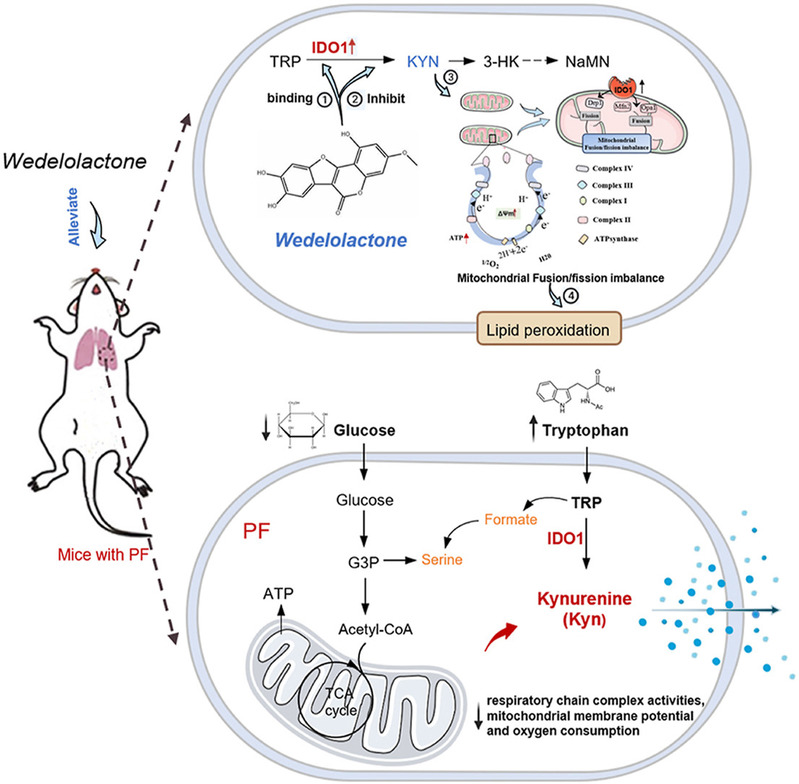 肺纤维化是一种高致死性呼吸系统疾病,临床治疗药物有限且副作用显著。团队前期发现IDO1在肺纤维化患者及动物模型中显著上调,并与胶原蛋白等纤维化标志物呈正相关。通过空间代谢组学、转录组学发现IDO1敲除小鼠可显著抑制肺成纤维细胞的增殖、分化、线粒体生物发生以及氧化磷酸化功能,从而减轻肺纤维化病理损伤。通过对小分子药物库的高通量筛选和结合验证发现,天然产物蟛蜞菊内酯(Wedelolactone, WEL)通过共价结合IDO1的K242位点,逆转线粒体功能障碍和脂代谢紊乱,显著改善小鼠肺纤维化病理表型,相同剂量下疗效与优于临床药物尼达尼布。该研究首次提出IDO1作为肺纤维化线粒体代谢调控枢纽,为靶向IDO1的药物开发提供全新策略。相关工作以“The crucial function of IDO1 in pulmonary fibrosis: From the perspective of mitochondrial fusion in lung fibroblasts and targeted molecular inhibition”为题发表于Acta Pharmaceutica Sinica B。博士研究生王磊为第一作者,色色视频 张朝凤教授与南京鼓楼医院张楼乾主任为共同通讯作者,色色视频 为第一通讯单位。