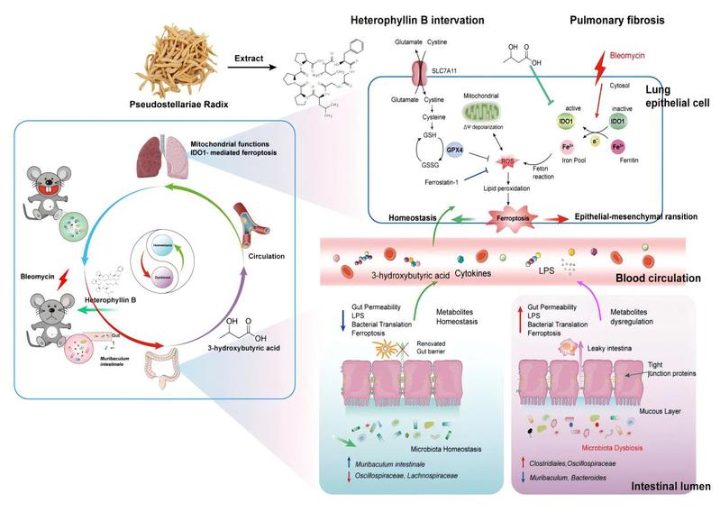 近期,该团队还聚焦于肠-肺轴多靶标天然产物的发现与机制研究,发现太子参环肽B(Heterophyllin B, HB)可通过调控肠道菌群Muribaculum intestinale及其代谢产物3-羟基丁酸(3-HA),抑制IDO1介导的铁死亡,从而缓解肺纤维化的新机制。研究通过多组学分析、基因敲除动物模型及临床样本验证,阐明IDO1通过积累Fe²⁺引发脂质过氧化和铁死亡,而HB通过重塑肠道微生态、促进3-HA生成,显著抑制IDO1活性并修复肺组织损伤。该研究为肺纤维化治疗提供了“肠-肺轴”调控新视角,并进一步推动靶向IDO1的天然药物研发。相关工作以“Murbaculum intestinale-derived 3-hydroxybutyric acid from Heterophyllin B attenuated pulmonary fibrosis through IDO1-mediated ferroptosis”为题发表于Pharmacological Research。博士研究生陈策为第一作者,色色视频 张朝凤教授与日本东邦大学李巍教授为共同通讯作者,色色视频 为第一通讯单位。