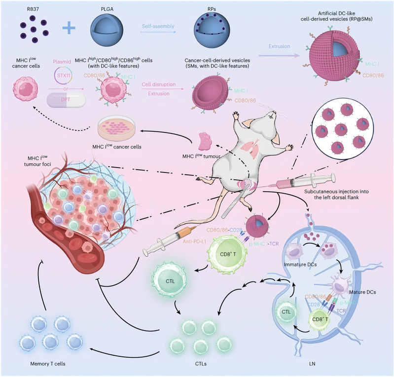 团队发挥天然药物化学研究优势,充分利用天然产物的特点,通过多学科交叉,进一步解决了个性化疫苗“制备速度”这一临床关键瓶颈。研究筛选并发现了天然小分子-去氧鬼臼毒素(DPT),可作为 STX11 基因工程策略的功能替代物,快速诱导肿瘤细胞获得 DC 样特征。基于 DPT 的小分子重编程策略显著缩短了疫苗制备时间,同时保持了与基因工程策略相当的治疗效果,大幅提升了术后个性化免疫治疗的临床可行性。该研究将天然产物调控、肿瘤囊泡工程与个性化肿瘤免疫治疗有机融合,系统展示了从机制发现、疫苗构建到术后转移模型验证的完整研究链条,为术后转移性癌症的快速响应式免疫治疗提供了具有转化潜力的新策略。