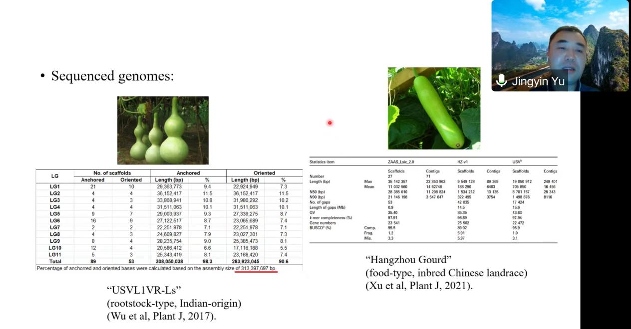 于景印博士作了题为“Genome Resequencing and Pan-Genome Analyses Provide Insights into Genomic Divergence of Bottle Gourd Populations”的报告。他从基因组重测序、泛基因组和系统生物学角度,针对葫芦科植物的种群进化和遗传多样性进行专题报告。研究团队通过对全球196份代表性种质资源的重测序,构建了葫芦基因组变异图谱,证实了美洲葫芦起源于非洲葫芦的报道。并使用“map-to-pan”策略,构建了第一个全面的葫芦泛基因组,发现不同群体间的基因存在/缺失变异主要参与了对生物和非生物胁迫的反应。