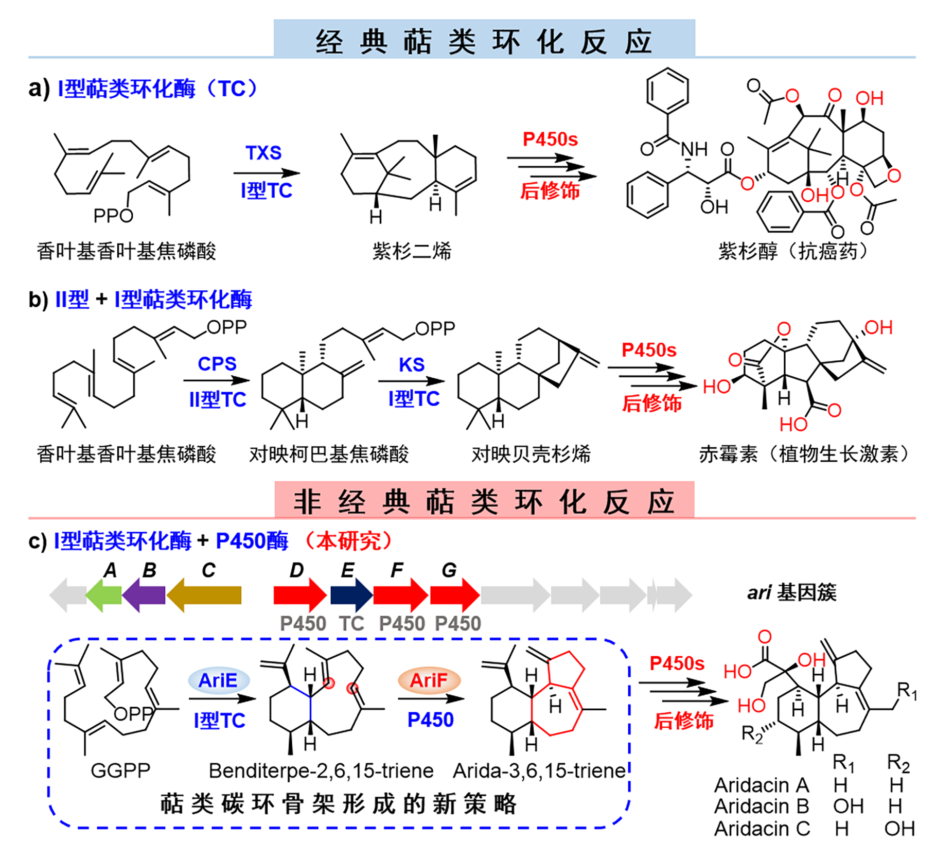 作为自然界中最复杂的化学反应之一,萜类天然产物生物合成中的环化反应,通常由两类经典的萜类环化酶催化,即I型和Ⅱ型萜类环化酶。I型萜类环化酶通过其保守的酸性催化基序,联合镁离子脱去萜类化合物线性前体携带的焦磷酸基团形成碳正离子进而发生环化。Ⅱ型萜类环化酶则由其保守的酸性催化基序,质子化底物的双键或者环氧基团形成碳正离子,进而环化为基本的萜类碳环骨架。然而,自然界中具备萜类环化功能的酶家族不止这两类,其中就包括细胞色素P450酶。目前仅发现三种酶(PenM/PntM,TwCYP71BE86及VrtK)能够通过介导碳正离子的形成,引发环化或者重排反应,但均作用于萜类生物合成的后修饰阶段。迄今为止,尚未有研究报道P450酶介导萜类碳环骨架的早期构建。