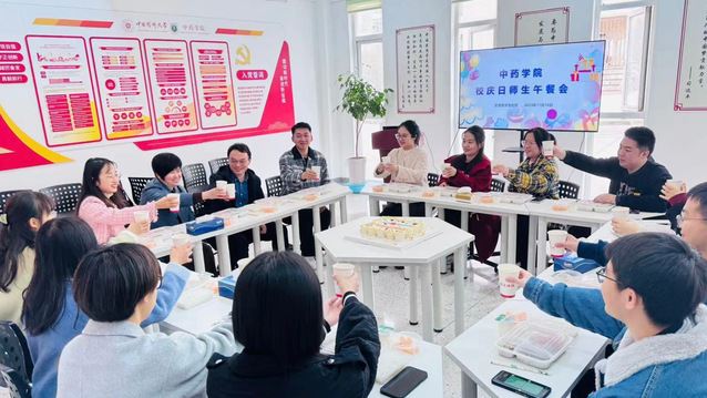 餐叙过程中,师生共同欣赏了学校一路发展的老照片集锦,感受了老一辈药大人坚持不懈的拼搏与努力,学校87年的发展历程离不开一代代药学建设者和奉献者。活动现场学生踊跃发言,分享了各自的生涯规划,畅谈药学梦想,表达了对学校的感谢。最后,师生一起分享了庆生蛋糕,活动现场气氛热烈。